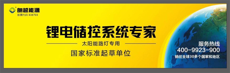 安徽朗越能源股份有限公司,国家级高新技术企业,新三板挂牌公众企业(股票代码:838703).公司专注于为太阳能路灯配套的锂离子电池及锂电储能领域的系列产品研究、设计、生产和销售。主导并参与编制《独立太阳能光伏电源系统技术要求》、《太阳能路灯用锂离子电池组技术规范》、《太阳能路灯用锂离子电池组安全认证规则》等国家标准及行业标准。